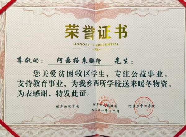 近日,著名藏族歌手阿桑格来鹏措正式发起《第四届暖冬玉树行》公益慈善活动被社会的更多爱心人士关注,于2021年12月14日为青海省玉树藏族自治州曲麻菜、称多、杂多三县的十所偏远山区寄宿制小学捐助了暖冬物资,用爱心为孩子们筑起抵御寒冬的温暖防线。